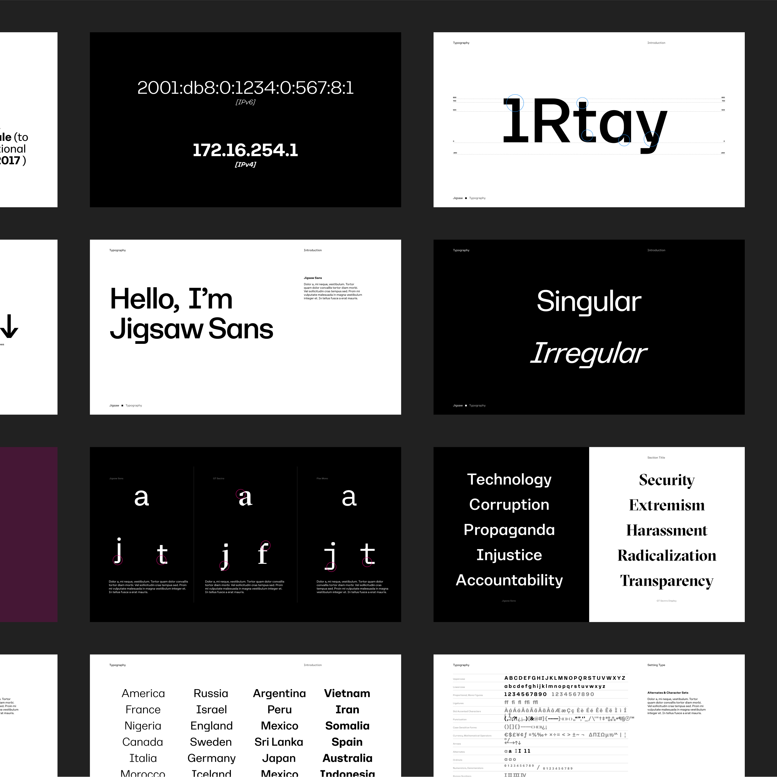 Jigsaw Sans draws on the medium contrast, closed apertures, and vertical proportions of mid-century sans serifs—Forma, in particular, was a key point of inspiration. The creation of the type family and the redesign of Jigsaw’s online presence took place side by side, the fonts evaluated and refined with each iteration of the website. Over the course of the process, we calibrated the weights to suit Jigsaw’s needs, refined the spacing and character widths for setting text on screen, added an alternate a for readability at small sizes, and increased the italic angle to a noticeable 18° so that the slanted styles could take on a more expressive role.